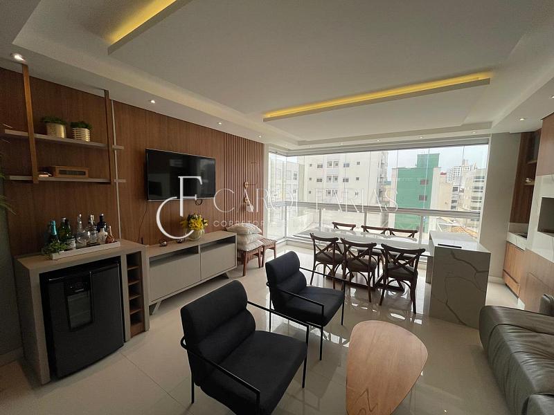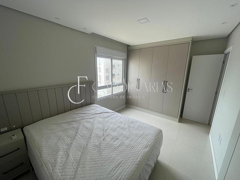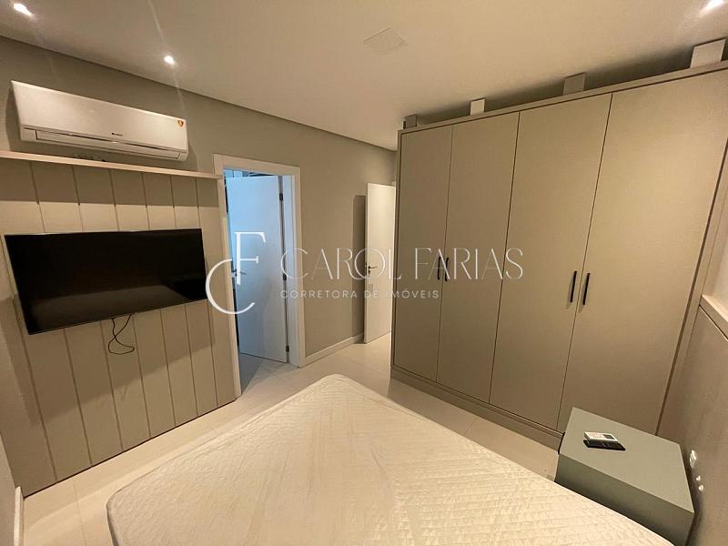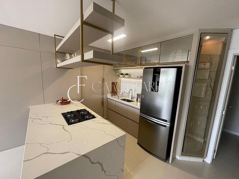 Jurerê Internacional conta 112,85m² de área privativa, mobiliado, climatizado, 03 suítes, 02 vagas de garagem, hobby box, sala de estar e jantar, cozinha, área de serviço, lavabo, churrasqueira a carvão e vista para o mar.